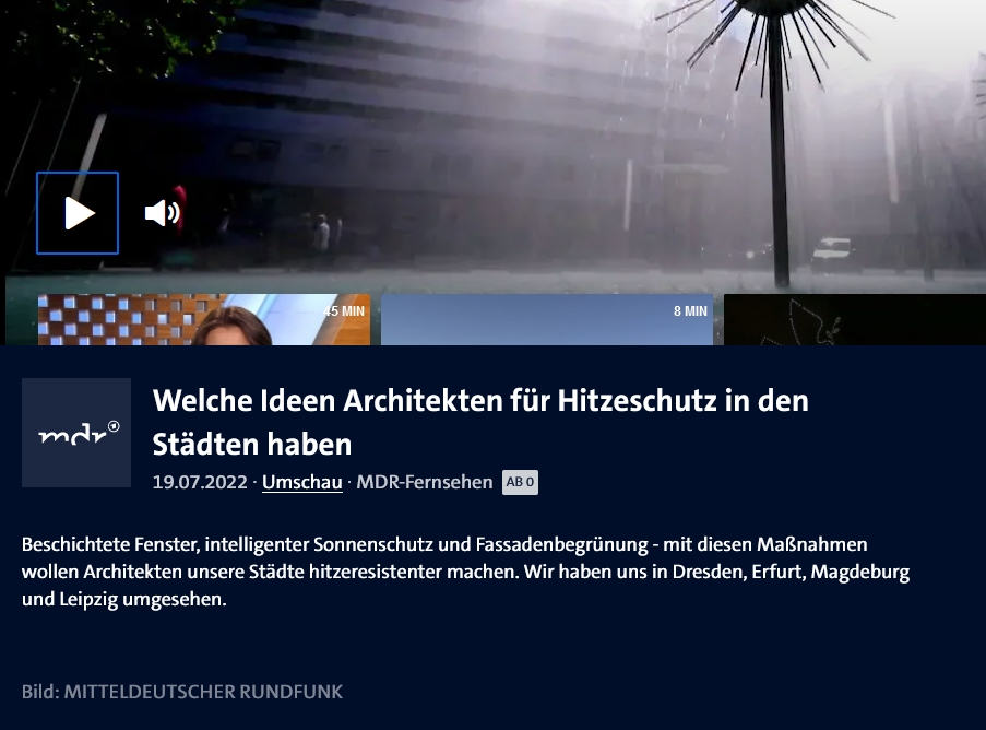 Beschichtete Fenster, intelligenter Sonnenschutz und Fassadenbegrünung - mit diesen Maßnahmen wollen Architekten Städte hitzeresistenter machen. Das Fernsehteam des MDR hat sich in Dresden, Erfurt, Magdeburg und Leipzig umgesehen. VertiKAA ist eines der vorgestellten Lösungsvorschläge.